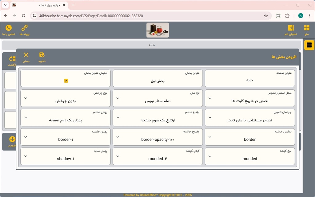پس از ورود عنوان و تنظیمات مربوط به بخش، بر روی دکمه ذخیره کلیک، و سپس بر روی دکمه بستن کلیک نمایید.