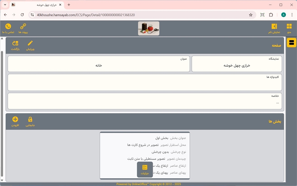 بر روی دکمه جزئیات کلیک نمایید. همچنین برای انتخاب صفحه سفارشی برای صفحه اول سایت بر روی دکمه صفحه اول کلیک نمایید.