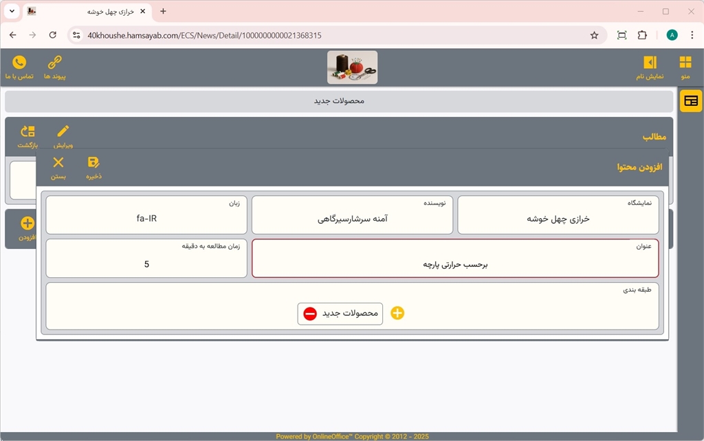 پس از ورود عنوان، زمان مطالعه به دقیقه و طبقهبندی های مورد نیاز محتوای مطالب خبری، بر روی دکمه ذخیره کلیک نمایید.