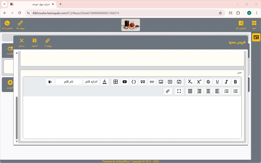 برای افزودن محتوا به مطالب خبری، بر روی دکمه افزودن کلیک نمایید.