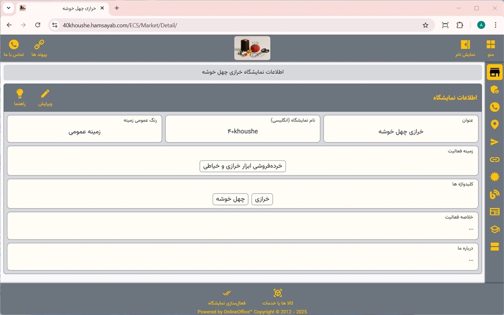 برای افزودن کالا یا خدمات در صفحه اطلاعات نمایشگاه، بر روی دکمه کالاها یا خدمات کلیک نمایید.